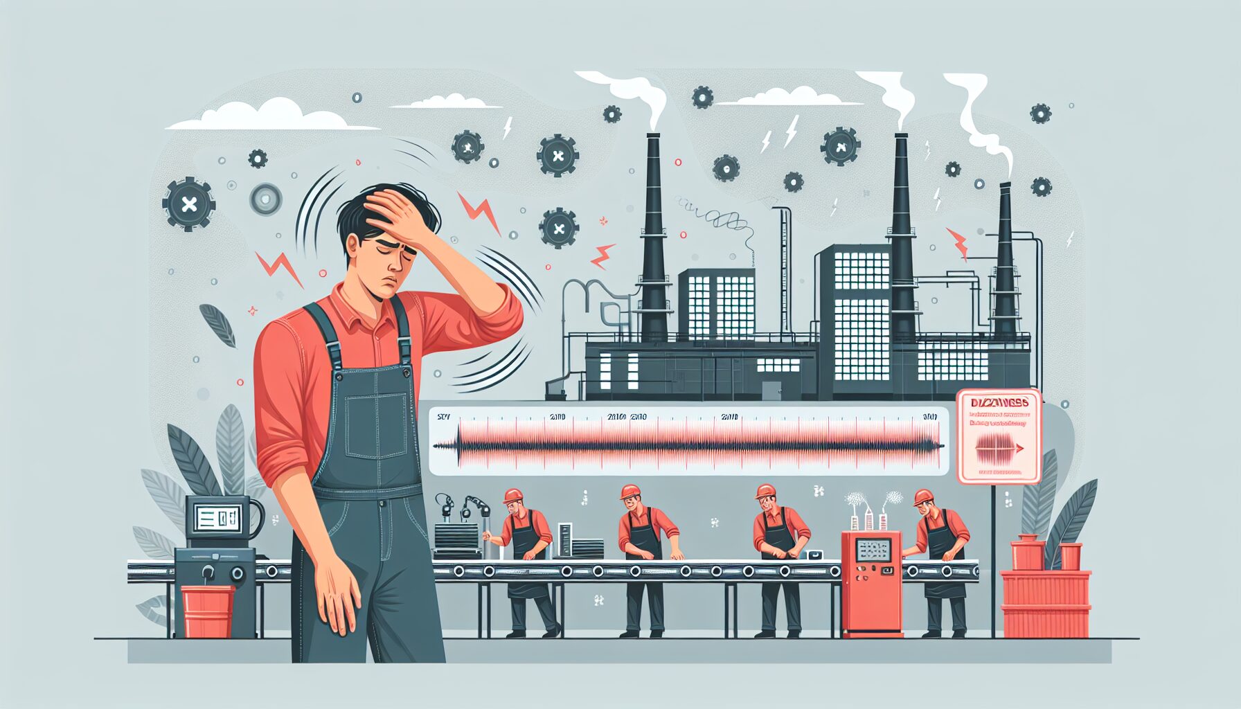 2. 振動障害:製造機器からの持続的な振動は、手や腕だけでなく全身に影響し、めまいの原因となることがあります。特に金属加工や組立ラインでの作業では、微細振動の長期暴露により平衡感覚に異常をきたすケースが報告されています。